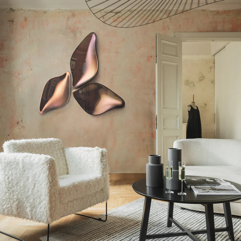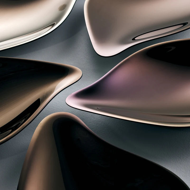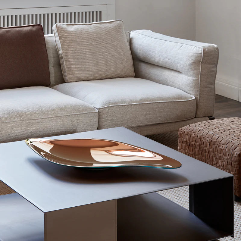 Our custom-made fused glass and titanium artwork is a stunning masterpiece, handcrafted with the author's unique technique to radiate unparalleled charm and beauty. The artwork features a mirrored titanium coating and wavy glass surface, creating an interplay of reflections that adds depth and dimension to any space. It is versatile and can be displayed in 12 different positions, making it a true statement piece.