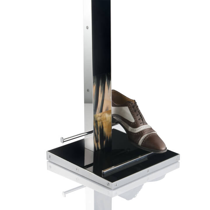 Wardrobe valet. Structure in wood with lacquered black gloss finish and dark horn inlays. Stainless steel edging with exposed screws. Stainless steel shoe rack and trouser bar. Catch-all tray in stainless steel lined with black saffiano leather.